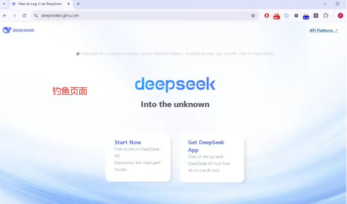 以釣魚網(wǎng)站“https://deepseeklogins.com/”為例,其頁(yè)面結(jié)構(gòu)和風(fēng)格與 DeepSeek 官方網(wǎng)站高度相似,旨在通過偽造官方頁(yè)面來(lái)誘導(dǎo)用戶泄露敏感信息。與真實(shí)網(wǎng)站相比,釣魚頁(yè)面移除了中英文切換的超鏈接。在該釣魚頁(yè)面中,點(diǎn)擊右上角的“API Platform”鏈接將會(huì)引導(dǎo)用戶跳轉(zhuǎn)到偽造的登錄頁(yè)面。